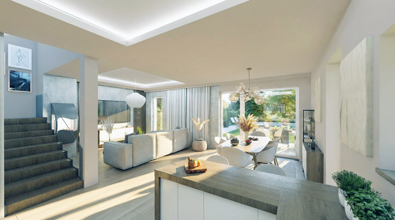 Wizualizacje zewnętrzne 3D – to realistyczne obrazy przedstawiające budynek, jego bryłę oraz relację z otoczeniem. Pokazują projekt w kontekście działki, sąsiedztwa oraz założeń architektonicznych. Dzięki nim klient może zobaczyć, jak projekt będzie wyglądał w rzeczywistości i lepiej zrozumieć jego formę.